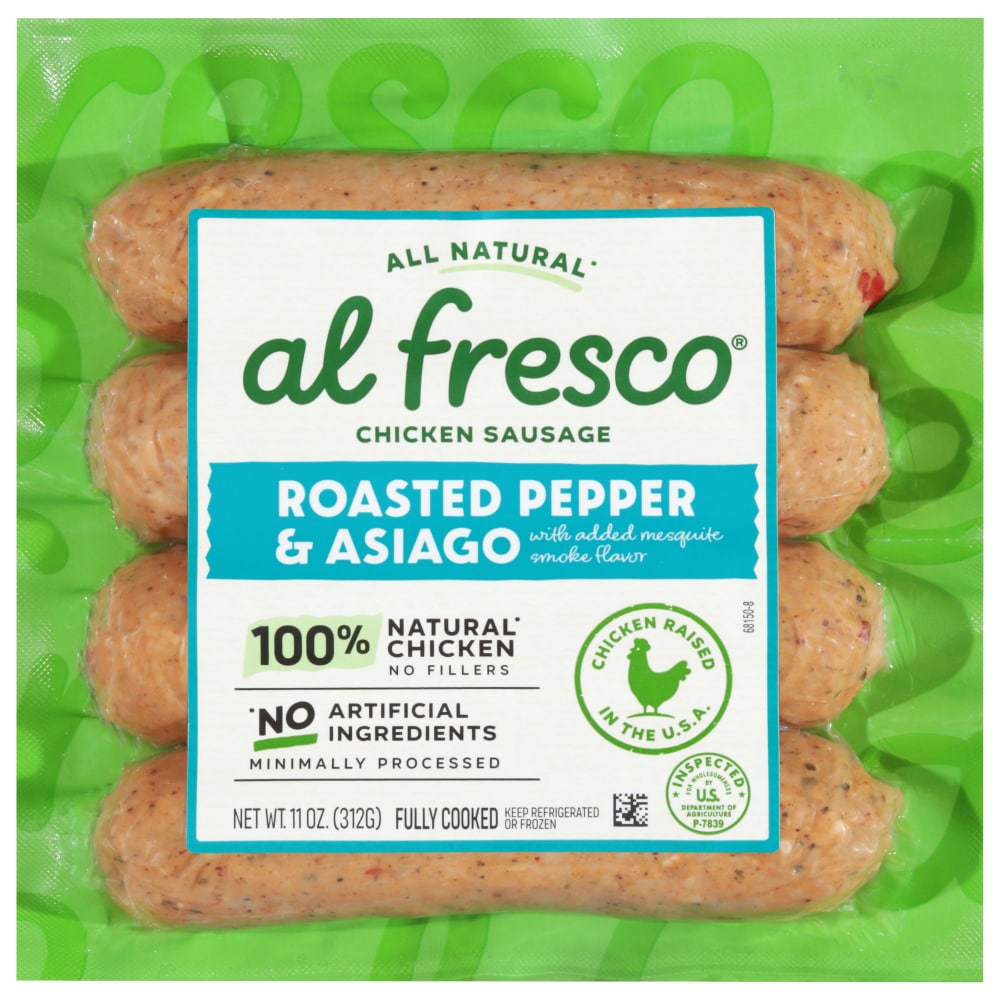 Chicken, swiss cheese ([part skim milk, cheese culture, salt, enzymes], potato starch, corn starch, powdered cellulose [added to prevent caking]), roasted garlic (with olive oil), contains 2% or less of the following: salt, spice, gruyere cheese (pasteurized milk, cheese culture, salt, enzymes, potato starch, corn starch, powdered cellulose [added as an anticaking processing aid]), parsley, celery powder, sea salt. Stuffed in a natural pork casing.