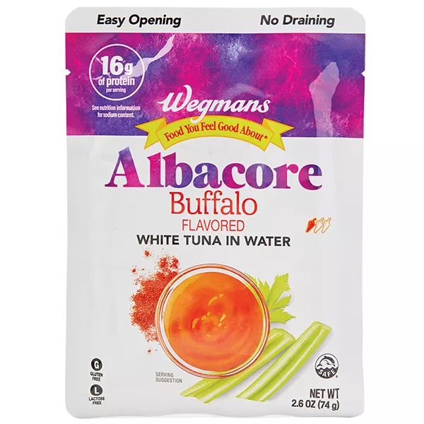WHAT'S INSIDE: 2.5 ounces of Buffalo flavored tuna. WHY YOU'LL LOVE IT: This tuna is great for a meal or snack. This tuna is sustainably sourced and certified dolphin safe.. HIGH QUALITY, LOW PRICES: Amazon Fresh brand products are all about high-quality food that fits every budget, every day.. ONLY FROM AMAZON: Look for the Amazon Fresh label to find great deals on a wide selection of grocery essentials.