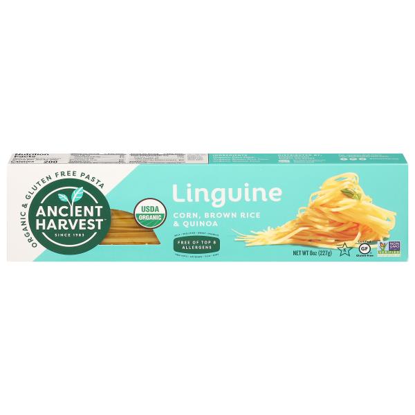 ANCIENT HARVESTâS ORGANIC SUPERGRAIN PASTA LINGUINE - THE ANSWER TO YOUR SEARCH FOR AN HONEST PASTA FOUNDATION TO ANY DISH. OUR SUPERGRAIN PASTA BRINGS OUT YOUR CREATIVE SIDE WITH THE SATISFYING TASTE, TEXTURE AND APPEAL OF TRADITIONAL WHEAT NOODLES â WITHOUT THE WHEAT. THIS PASTA IS CRAFTED FROM ORGANIC CORN FLOUR AND QUINOA FLOUR. EACH 8 OZ. BOX OF PASTA IS VERIFIED BY THE NON-GMO PROJECT AND ENTIRELY GLUTEN-FREE WHILE BEING LOADED WITH 4G OF PROTEIN AND DIETARY FIBER PER SERVING. OUR PASTA...