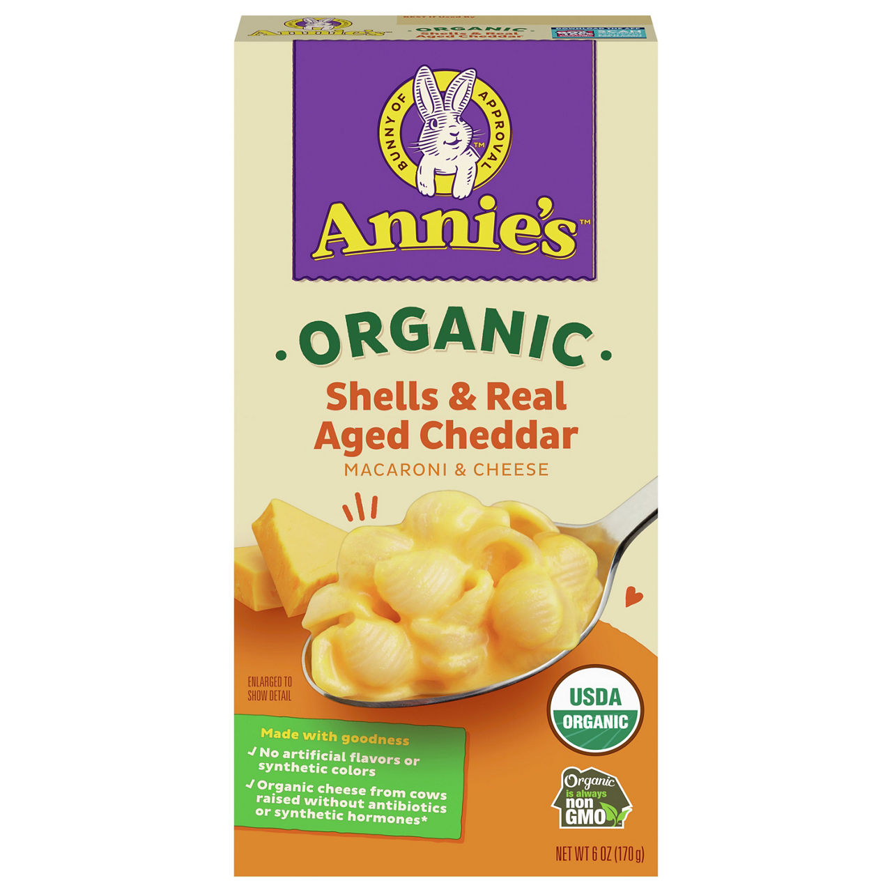 ORGANIC PASTA (ORGANIC WHEAT FLOUR, ORGANIC WHOLE GRAIN WHEAT FLOUR), ORGANIC DRIED CHEDDAR CHEESE (ORGANIC CULTURED PASTEURIZED MILK, SALT, NON-ANIMAL ENZYMES), ORGANIC WHEY, ORGANIC NONFAT MILK, ORGANIC BUTTER, SALT, SODIUM PHOSPHATE, ORGANIC ANNATTO EXTRACT (FOR COLOR), SILICON DIOXIDE (FOR ANTICAKING).