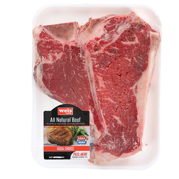 Our Wegmans Brand Angus beef is humanely raised on family farms near our stores without antibiotics or added hormones. This U.S.D.A. Choice angus porterhouse steak is two steaks in one, a strip steak on one side, and a tenderloin on the other, separated by a t-shaped bone. A porterhouse steak has a larger tenderloin than a T-bone steak. This steak has excellent marbling which delivers exceptional flavor.