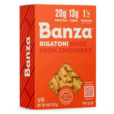 20g of plant-based protein per serving, which is 50% more than the leading traditional pasta brand. 100% GFCO-certified gluten free, vegan, vegetarian, kosher, non-GMO, and free from all major food allergens as per the FDA. 3X more fiber (8g per serving) and 25% fewer net carbs than the leading traditional pasta brand. Looks, cooks, and tastes like traditional pasta, making it the perfect choice for even the pickiest eater. Made with four simple ingredients, Banza Shells pasta pairs perfectly with all the sauces you know and love, such as creamy vodka, garden-fresh pesto, and classic marinara. In addition to 16 fun, shelf-stable pasta shapes, Banza's gluten-free lineup also includes pizza, mac & cheese, rice, and waffles!