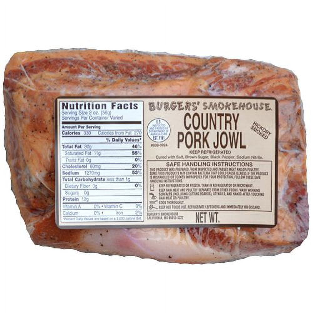 Bear Creek Smoked Pork Jowls, Uncooked, Gluten-Free are home cured and slowly smoked for rich, irresistible flavor. Slice, cook and enjoy like the bacon you're used to, or add to your favorite dishes for a unique, mouth-watering flavor. Soups, stews, beans, black-eyed peas, leafy greens and more, are made better when seasoned with our Smoked Jowls! 1-1.25 lb per package. 300 calories per serving.