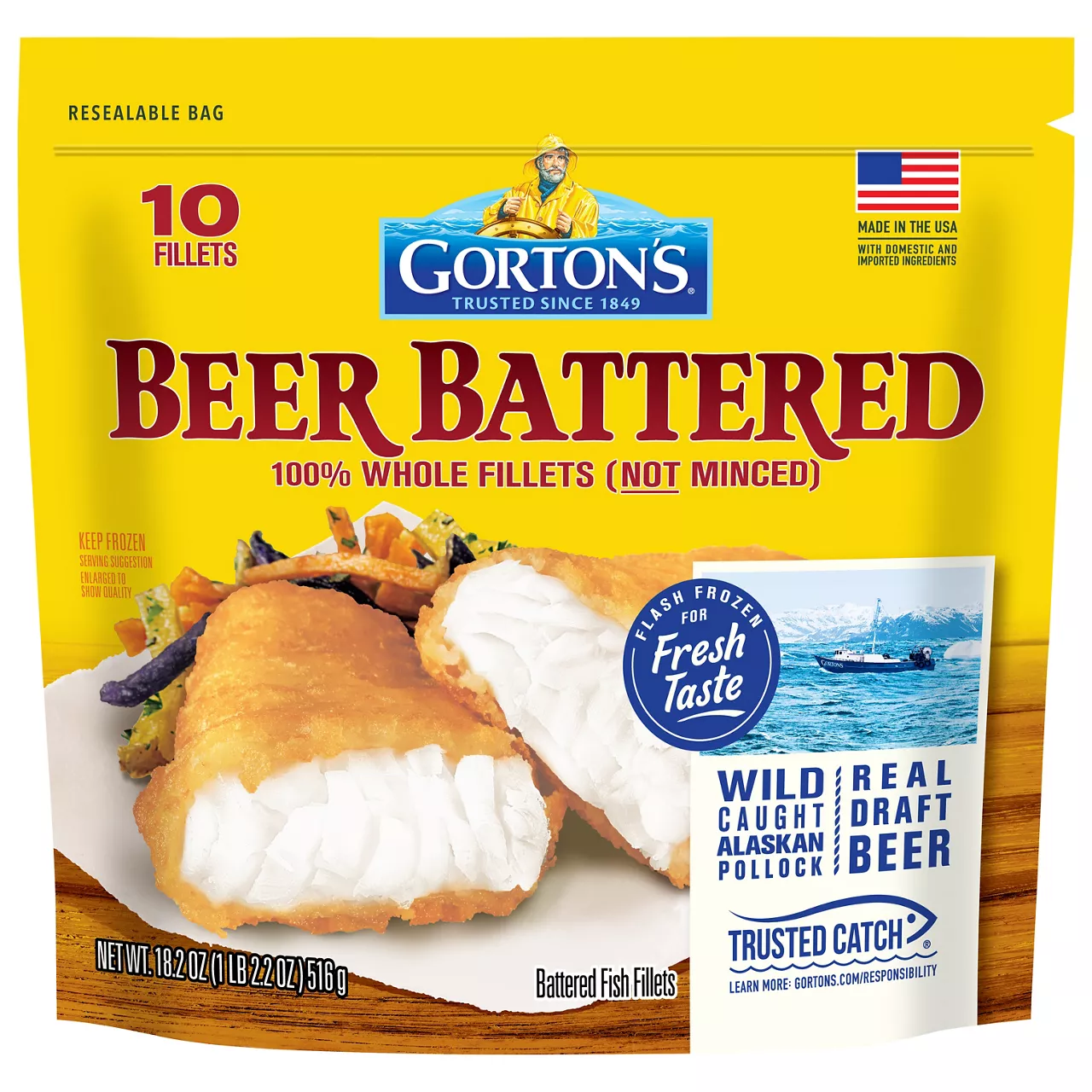 Gorton's Crispy Battered Fish 100% Whole Fillets (Not Minced), Wild Caught Alaskan Pollock, Frozen, 10 Count, 19 Ounce Resealable Bag