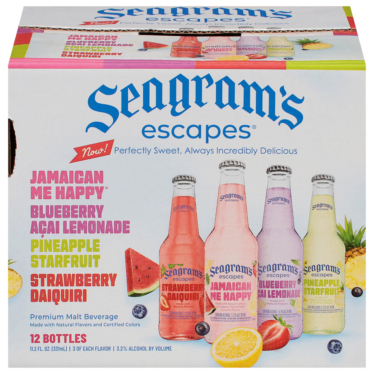 Our bestselling variety pack with SIX unique flavors: Jamaican Me Happy, Calypso Colada, Strawberry Daiquiri, Classic Lime Margarita, Wild Berries and Passionfruit Mango! SeagramâÂÂs Escapes is the iconic brand loved for flavor, color and relaxation! With more than 15 sweet, refreshing flavors including our fan fave Jamaican Me Happy, SeagramâÂÂs Escapes is the beach in a bottle: just open your go-to flavor, kick back, and enjoy the escape wherever you are. Make Happiness Happen with Seagram's...