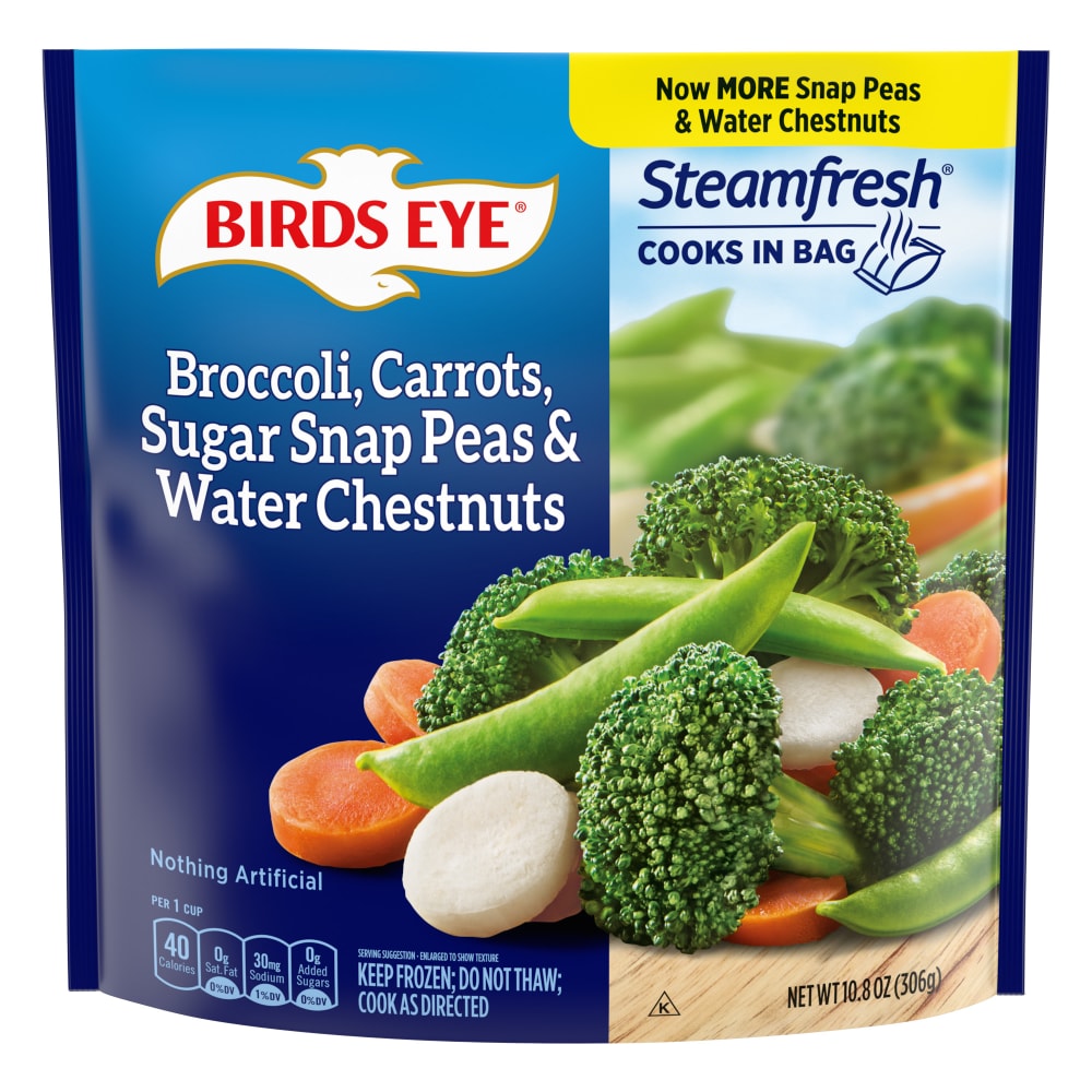 Birds Eye Steamfresh Broccoli, Carrots, Sugar Snap Peas & Water Chestnuts make it simple to serve up a vegetable mix your whole family will love. Picked at the peak of freshness, the frozen broccoli and mixed vegetables are flash frozen to lock in the flavor and freshness. Water chestnuts add an appealing crunchiness to the frozen mixed vegetables, which have nothing artificial added so you can enjoy the best. Serve these mixed frozen vegetables with your favorite family meals, or top the mixed veggies...