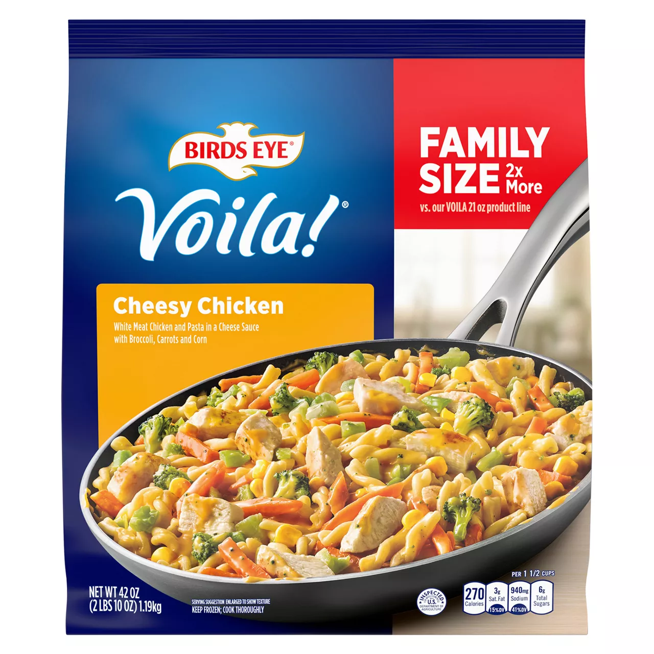 Birds Eye Voila! Family Size Cheesy Chicken serves up comfort food in an easy, complete skillet meal. Chicken and pasta with vegetables in a creamy cheese sauce create a hearty meal option. This classic chicken pasta dish gets fresh taste from the frozen mixed vegetables, that include carrots, broccoli and corn. It's also made with no artificial flavors. For a delicious and easy family meal, simply pour the sauce pouches and frozen meal ingredients into a skillet, or microwave the meal in a microwave-safe dish. Keep this chicken dinner in the freezer until you're ready to cook it. Its good to eat vegetables, so Birds Eye makes vegetables good to eat.
