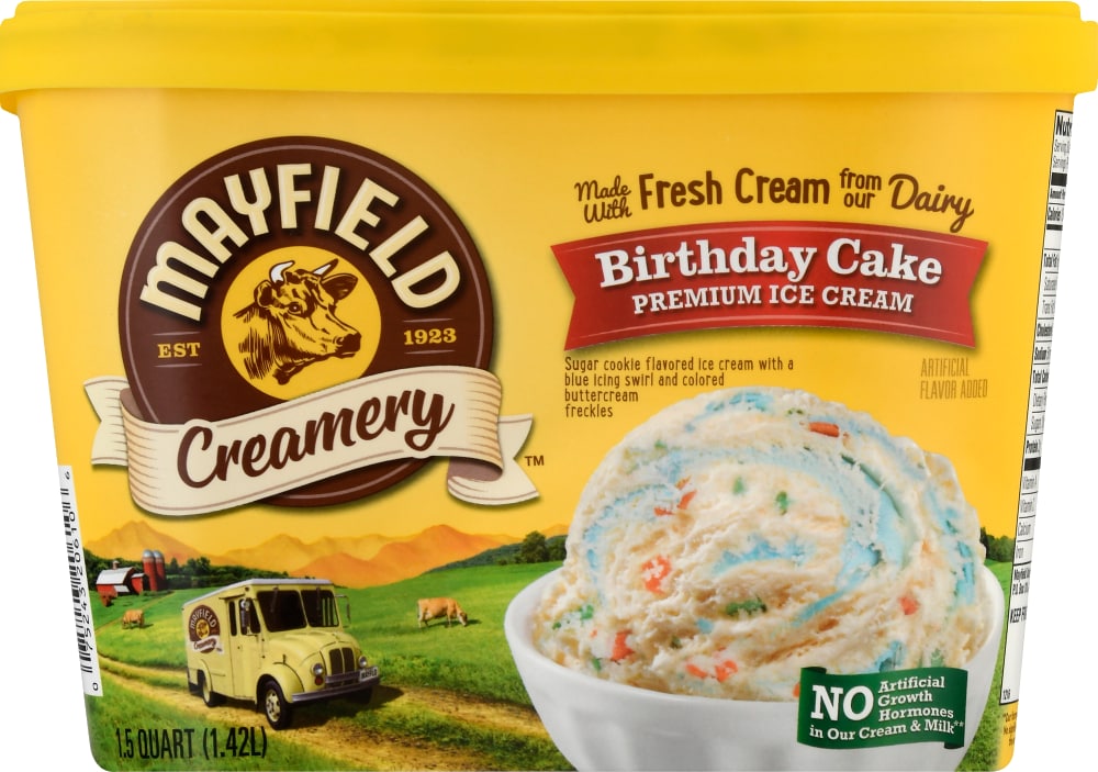 MILKFAT AND NONFAT MILK, SWEET CREAM BUTTERMILK, LIQUID SUGAR (SUGAR, WATER), CAKE PIECES (SUGAR, WHEAT FLOUR, EGGS, BUTTER [CREAM, SALT], MILK, CORNSTARCH, NATURAL FLAVOR, SOY LECITHIN, SALT), CORN SYRUP, VANILLA FROSTING FLAVOR (CORN SYRUP, WATER, SUGAR, NATURAL AND ARTIFICIAL FLAVOR, SODIUM CITRATE, CITRIC ACID), CANDY SPRINKLES (SUGAR, COCONUT OIL, SOYBEAN OIL, SOY LECITHIN, NATURAL AND ARTIFICIAL FLAVORS, RED 40, BLUE 1), WHEY, HIGH FRUCTOSE CORN SYRUP, CONTAINS LESS THAN 2% OF MONO AND DIGLYCERIDES, GUAR GUM, CALCIUM SULFATE, CAROB BEAN GUM, CARRAGEENAN.' '
