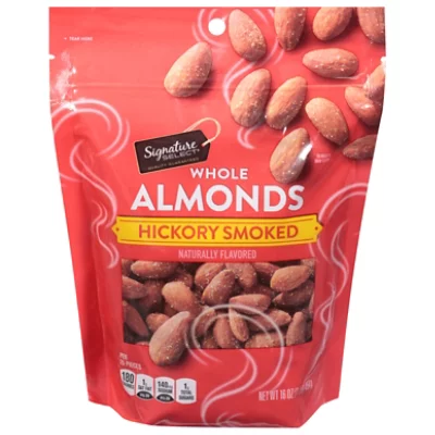 ALMONDS, VEGETABLE OIL (CANOLA, SAFFLOWER AND/OR SUNFLOWER), SALT, CORN MALTODEXTRIN, NATURAL HICKORY SMOKE FLAVOR, YEAST, HYDROLYZED CORN AND SOY PROTEIN AND NATURAL FLAVORS.