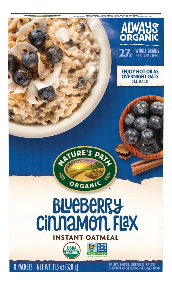 Total Fat 7 g 11%,Saturated Fat 1 g 5%,Trans Fat 0 g,Cholesterol 0 mg 0%,Sodium 310 mg 13%,Total Carbohydrate 49 g 16%,Dietary Fiber 8 g 32%,Sugars 11 g,Protein 7 g,Vitamin A 0%,Vitamin C 0%,Calcium 2%,Iron 60%,INGREDIENTS: Gluten Free Whole Grain Oats, Cane Sugar, Hazelnuts, Dried Blueberries, Chia Seed, Flaxseed, Blueberry Powder, Sea Salt.