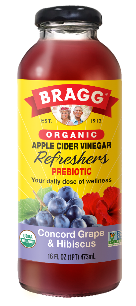 Organic drink made with organic apple cider vinegar, Concord grape juice, and apple juice Each bottle contains two tablespoons of Bragg Organic Apple Cider Vinegar Made from organically grown apples and contains the 'Mother' USDA Organic, Non-GMO Project Verified, Vegan, Kosher, and Gluten-Free Store unopened in a cool, dry place, shake gently before drinking, and refrigerate after opening