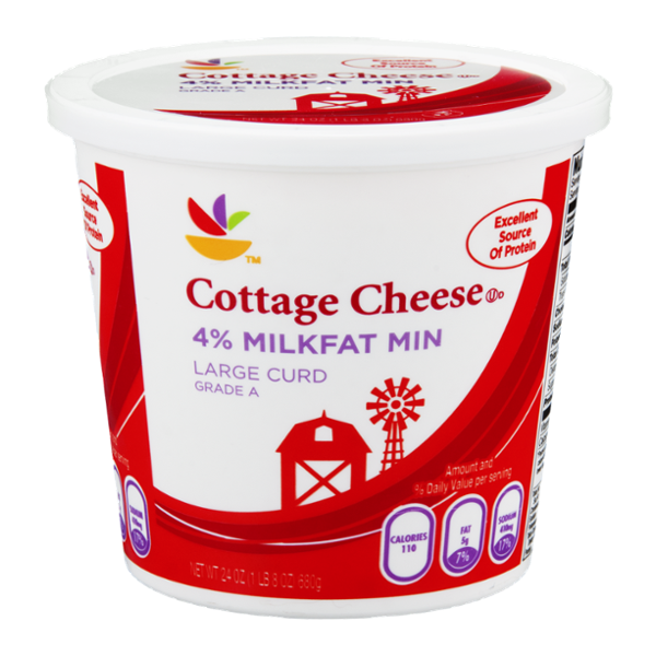 Breakstone's Large Curd Cottage Cheese with 4% Milkfat, 24 oz Tub. Breakstoneâs 4% milkfat large curd cottage cheese is delicious, creamy, and packed with protein. Since itâs origin in 1882 in Walton New York, each cup of Breakstoneâs cottage cheese is a celebration of craftsmanship and expertise evident in hand cut curds wrapped in a rich dressing for a fresh and delectable dairy experience. Each serving of Breakstoneâs 4% milkfat cottage cheese has 12g of protein and only 120 calories,...