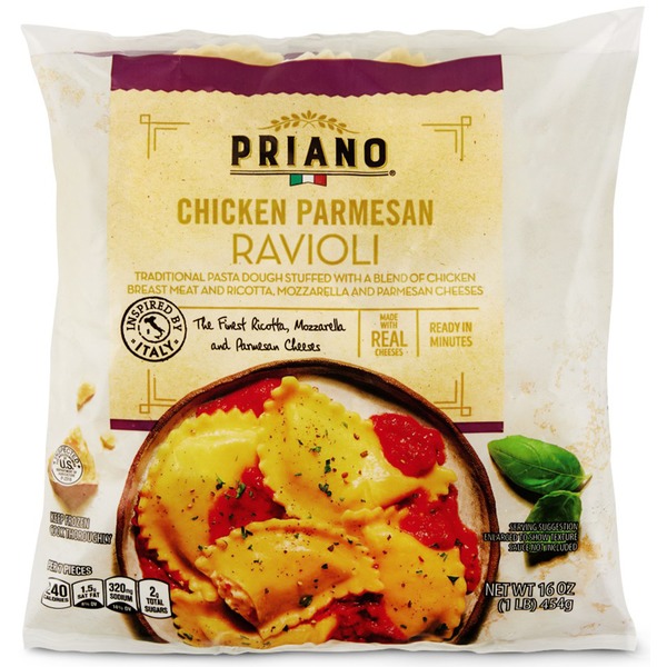 FILLING: CHICKEN (CHICKEN BREAST [BONELESS, SKINLESS CHICKEN BREAST WITH RIB MEAT, WATER, POTATO STARCH, SALT AND VINEGARI], RICOTTA CHEESE (PASTEURIZED MILK, PASTEURIZED WHEY, VINEGAR, SALT), LOW MOISTURE MOZZARELLA CHEESE (MILK, CHEESE CULTURES, SALT, ENZYMES), PARMESAN CHEESE (PART-SKIM COW'S MILK, CHEESE CULTURES, SALT, ENZYMES), BREADCRUMBS (ENRICHED FLOUR [WHEAT FLOUR, MALTED BARLEY FLOUR, NIACIN, REDUCED IRON, THIAMIN MONONITRATE, RIBOFLAVIN, FOLIC ACID), CONTAINS 2% OR LESS OF THE FOLLOWING: SUNFLOWER OIL, SUGAR, SALT, INSTANT DRY YEAST), GARLIC, POTATO FLAKES, POTATO STARCH, DRIED CITRUS PULP, SALT, SUGAR, PARSLEY, CHICKEN CONCENTRATE (CHICKEN BROTH, YEAST EXTRACT, SALT, SUGAR, CHICKEN FAT, POTATO STARCH, CONTAINS 2% OR LESS OF ONION POWDER, NATURAL FLAVORS). DOUGH: WHEAT FLOUR, DURUM WHEAT SEMOLINA, EGGS, WATER, SALT, BETA CAROTENE COLOR. CONTAINS: WHEAT, MILK, EGG.