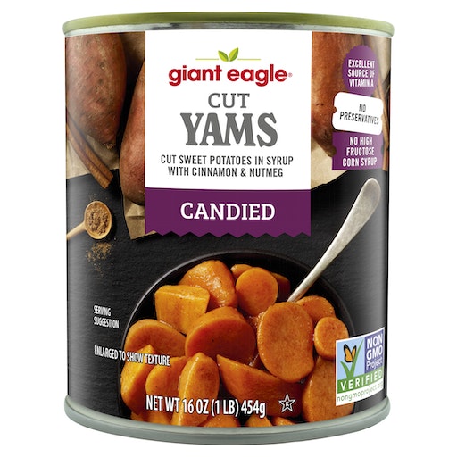 Cut sweet potatoes in syrup with cinnamon & nutmeg. Per 1/2 Cup: 150 calories; 0 g sat fat (0% DV); 230 mg sodium (10% DV); 29 g total sugars. Heart Healthy: While many factors affect heart disease diets low in saturated fat and cholesterol may reduce the risk of this disease. No preservatives. No corn syrup. Gluten free. Excellent source of vitamin A. Non GMO Project verified. nongmoproject.org. Our Quality Guarantee: Giant Eagle's commitment to quality is always 100% satisfaction or double your money back. Questions? Comments? Call 1-800-553-2324. GiantEagle.com.