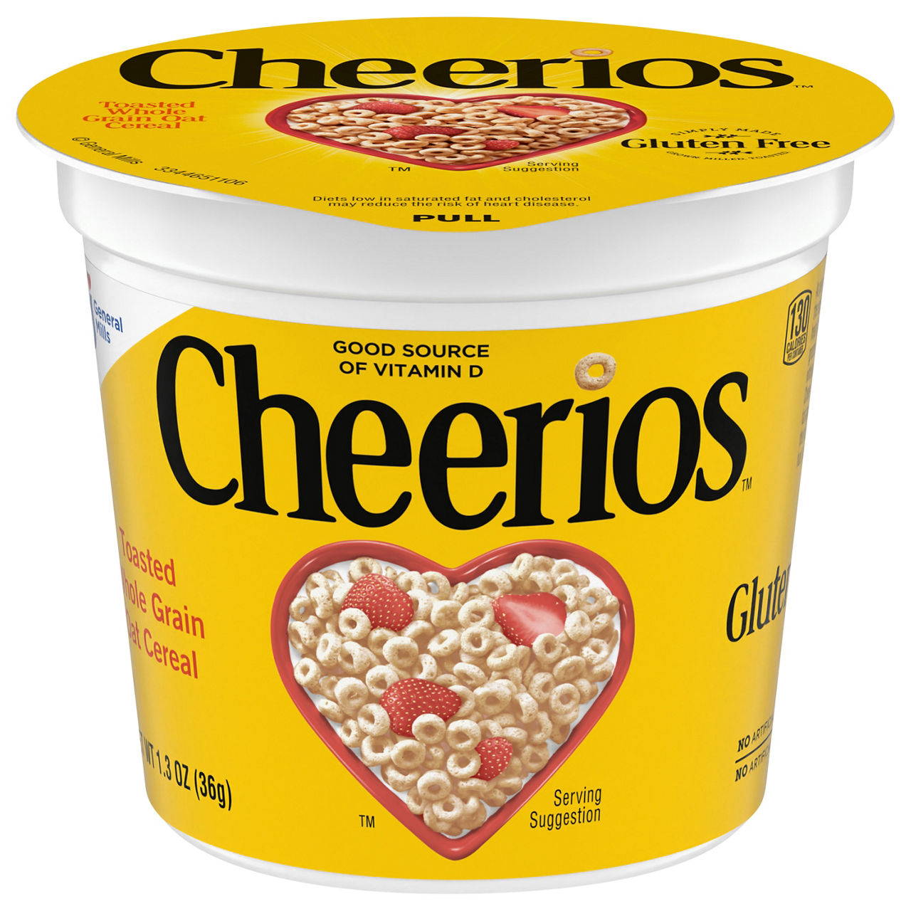 One 18 oz Family Size cereal box of General Mills Cheerios Heart Healthy Cereal This heart healthy cereal is cholesterol free and contains 2 g of soluble fiber per serving Whole grain cereal with 100% whole grain oats and no artificial flavors or colors A kosher, gluten free cereal perfectly sized for toddlers to practice their self feeding skills Serve this whole grain cereal with milk for a quick part of a kids breakfast or as toddler snacks