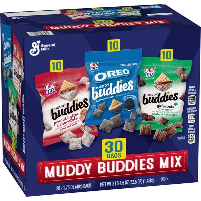 Crispy corn baked Chex pieces in a chocolatey peanut butter coating topped with a sweet, powdery coating Muddy Buddies are the irresistible combination of sweet, powdery smooth and crunchy Naturally and artificially flavored Sweet treats for lunch time, break time and anything in between Box Contains: 25 Trick-or-treat size pouches Box Tops for Education: Proud to support schools and teachers as an official participating product