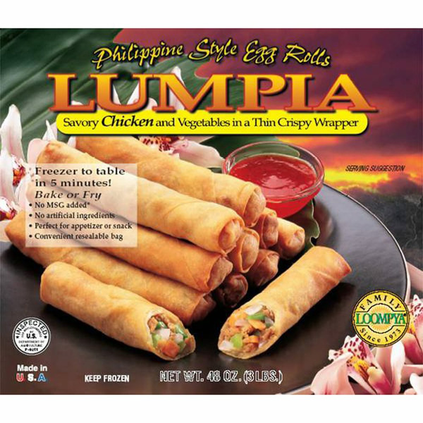 Spring roll shell (enriched flour, wheat flour, niacin, reduced iron, thiamin mononitrate, riboflavin, folic acid), water, soybeans, less than 0.5% of: sugar, salt, soybean oil, cornstarch, dextrose, hydrolyzed soy protein, mono and diglycerides, monosodium glutamate, preservatives (sodium propionate, sodium phosphate), oxidizer (calcium peroxide), dough conditioner (ascorbic acid, azodicarbonamide), garlic powder, propyl gallate, chicken, carrots, egg, onion, garlic, salt, black pepper.