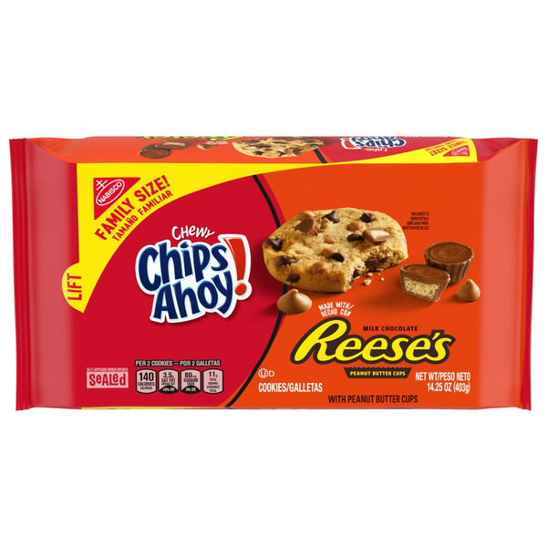 CHIPS AHOY! chocolate chip cookies are made with real chocolate and are a classic American treat.Resealable packs help your cookies stay fresh, which means you can look forward to enjoying (or sharing) a crunchy CHIPS AHOY! cookie whenever you’d like.Try a twist on the iconic chocolate chip cookie with this crunchy treat, which is packed with real chocolate chips, pieces of milk chocolate Reese’s Peanut Butter Cups, and peanut butter chips.