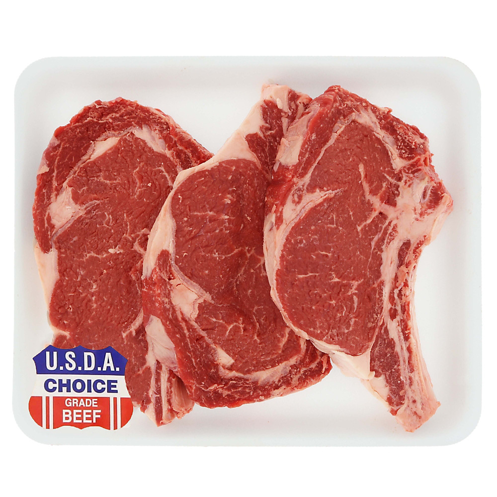 Cowboy Ribeye Steak, Bone-In, Choice Angus Beef, 1 per Tray, 0.63 – 1.72 lb 1 fresh bone-in ribeye steak per tray 1.25” thick cut steak USDA Choice Angus Beef, known for marbling, tenderness, and flavor 20g protein per serving Good source of iron, excellent source of protein and zinc per serving See below for product quality information, steak temperature guide and more