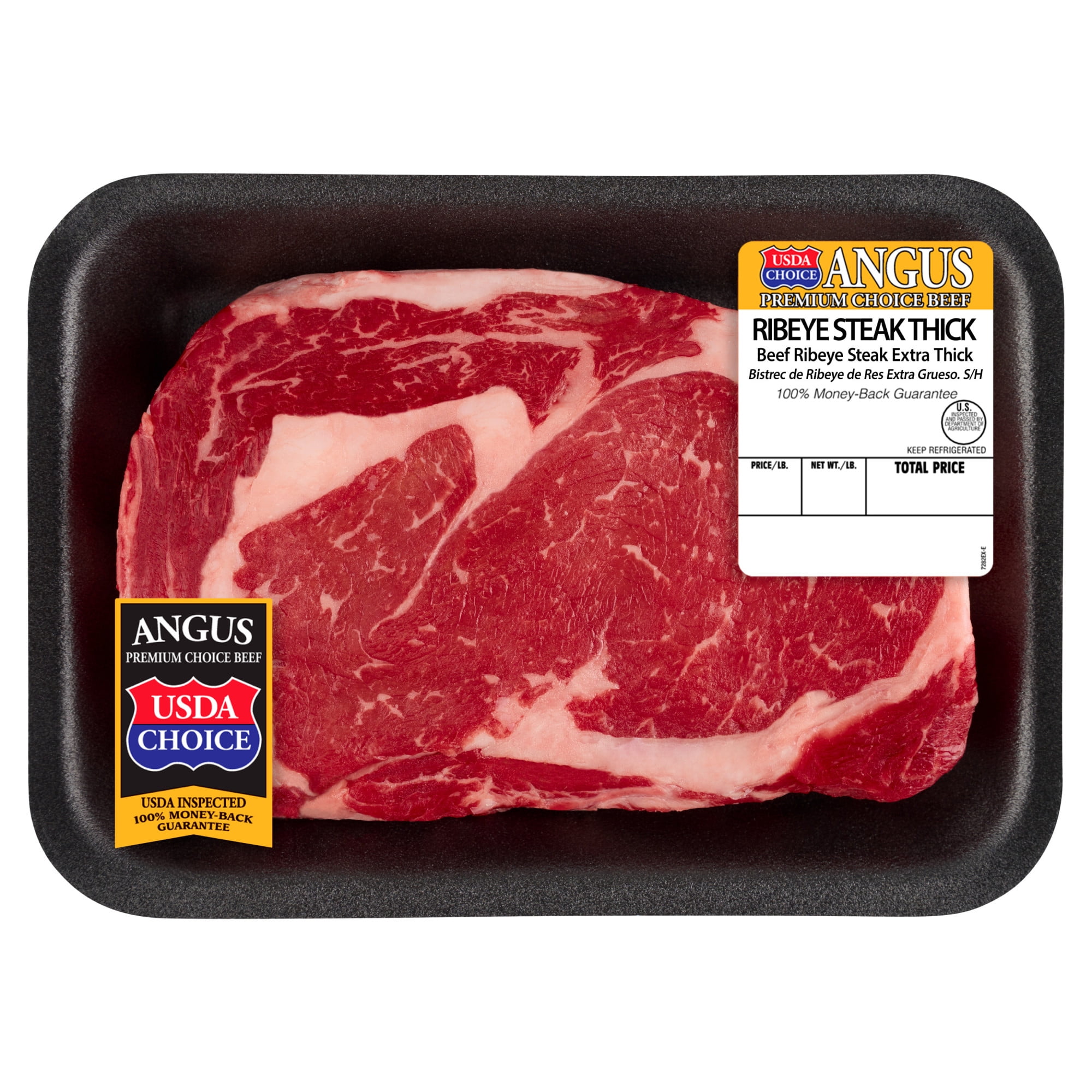 Thick Ribeye Steak, Choice Angus Beef, 1 per Tray, 0.81 - 1.47 lb 1 fresh ribeye steak per tray 1.625" thick cut steak USDA Choice Angus Beef, known for marbling, tenderness, and flavor 23g protein per serving Good source of iron, excellent source of protein and zinc per serving See below for product quality information, steak temperature guide and more