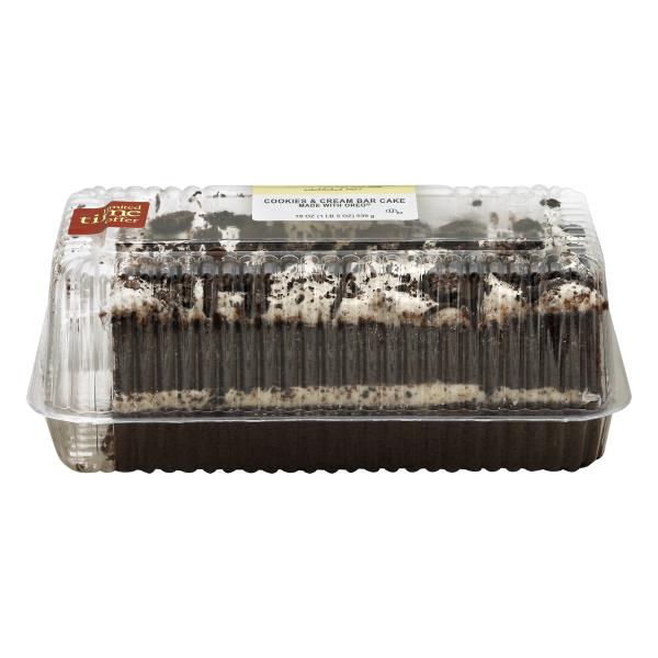 Three layers of chocolate and three layers of vanilla cake filled with cookies and cream mousse and iced with alternating stripes of mousse and buttercream. Coated with chocolate ganache and then garnished with sandwich cookies, chocolate bars, and chocolate pieces.
