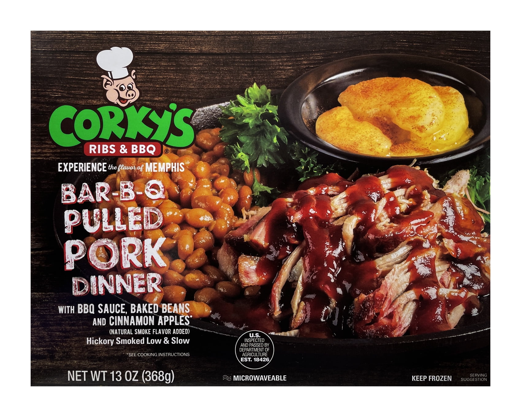 Bar-B-Q Pork Shoulder, Bar-B-Q Sauce (Water, Tomato Paste, High Fructose Corn Syrup, Molasses, Distilled Vinegar, Brown Sugar, Salt, Worcestershire Sauce (Distilled Vinegar, Molasses, Corn Syrup, Water, Salt, Caramel Color, Garlic Powder, Sugar, Spices, Tamarind, Natural Flavors), Cayenne Peppers, Natural Smoke Flavor, Dehydrated Onions, Soybean Oil, Dextrose, Dehydrated Garlic, Spice and Spice Extractives, Xanthan Gum, Sodium Benzoate, (Preservative), Guar Gum, Ascorbic Acid), Baked Beans (White Beans, Water, Sugar, Brown Sugar, High Fructose Corn Syrup, Salt, Pork and Mustard Flower) Seasonings (Brown Sugar, Mustard, Dehydrated Onion, Green Bell Pepper, Spice)), Cinnamon Apples (Apples (Prepared with Sodium Sulfite and Calcium Chloride), High Fructose Corn Syrup, Water, Sugar, Modified Corn Starch, contains 2% or less of the following: Lemon Juice, Apple Juice Concentrate, Potassium Sorbate (as a preservative), Cinnamon, Salt, Citric Acid, Nutmeg).