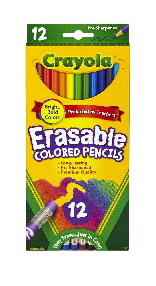 12 Erasable Colored Pencils, with an eraser on every pencil, let kids easily make changes to schoolwork and drawings. This pencils are made from reforested wood, which is unique to Crayola and never from tropical rainforests. 12 bright, intense colors with smooth lay down. Visit the Crayola dotcom site for easy Create-it-Yourself project ideas and instructions. Access free coloring pages for artists of all ages.