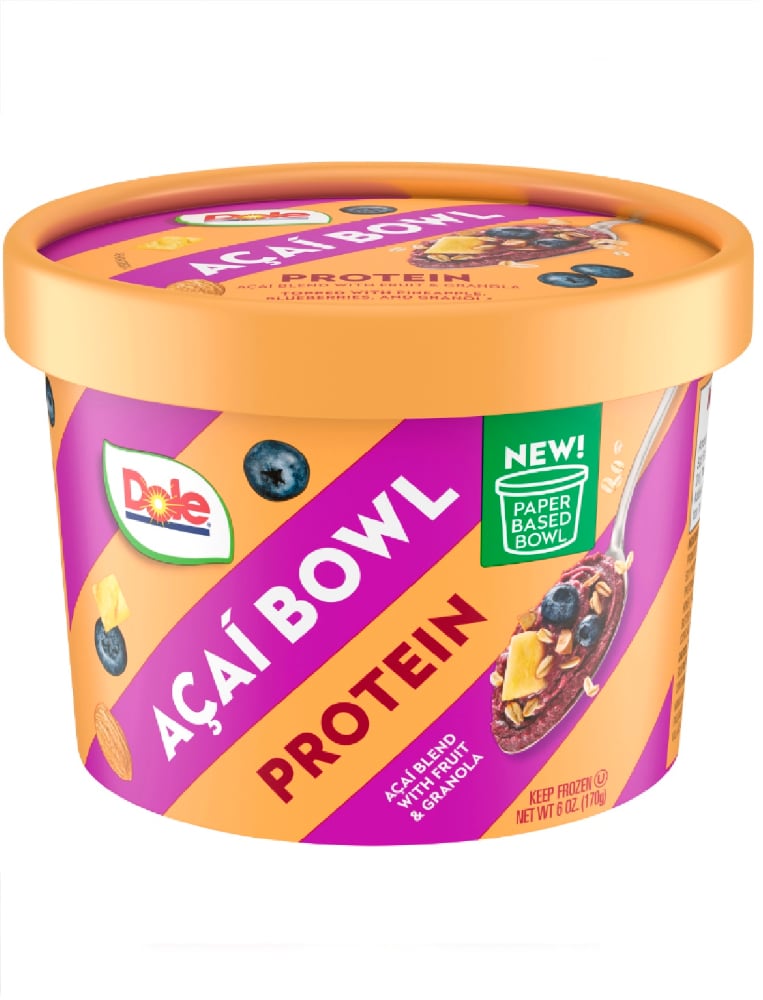 Protein acai blend made with acai puree, bananas, honey, and almond butter Frozen acai smoothie bowl topped with pineapple, blueberries, honey oat granola, protein crisps, and almond bits Pack in your lunch bag or backpack for an after-school snack or post-game treat 5 grams of protein and 230 calories per acai bowl Non-GMO Enjoy 100% All Natural Fruit with Dole: Fruit Bowls, Fruit Juice, Canned Fruit, Jarred Fruit, Frozen Fruit Smoothies, Frozen Acai Bowls, and Frozen Dippers