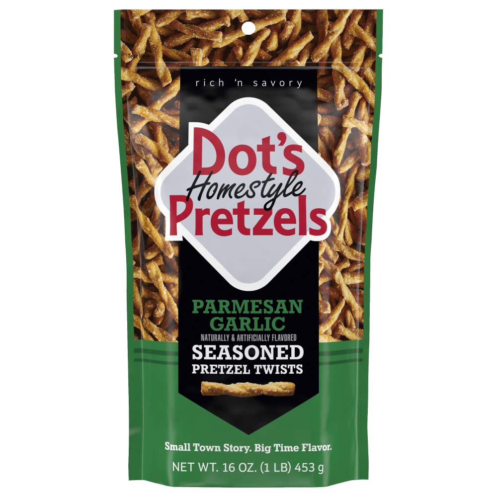 Homestyle pretzel twists featuring Dot's top-secret Parmesan Garlic seasoning blend A delightful swirl of buttery, sweet, and cheesy flavors Pour into a snack mix, add to back to school snacks, use in a recipe, or enjoy straight from the bag Perfect for school lunch ideas like back to school snacks, classroom snacks, lunch snacks, after school snacks for kids, and pretzels for school Perfect for sharing a quick snack with friends and family or snacking on your own Packaged in a resealable 5-ounce size bag Fish-free: Safe for those with seafood allergies