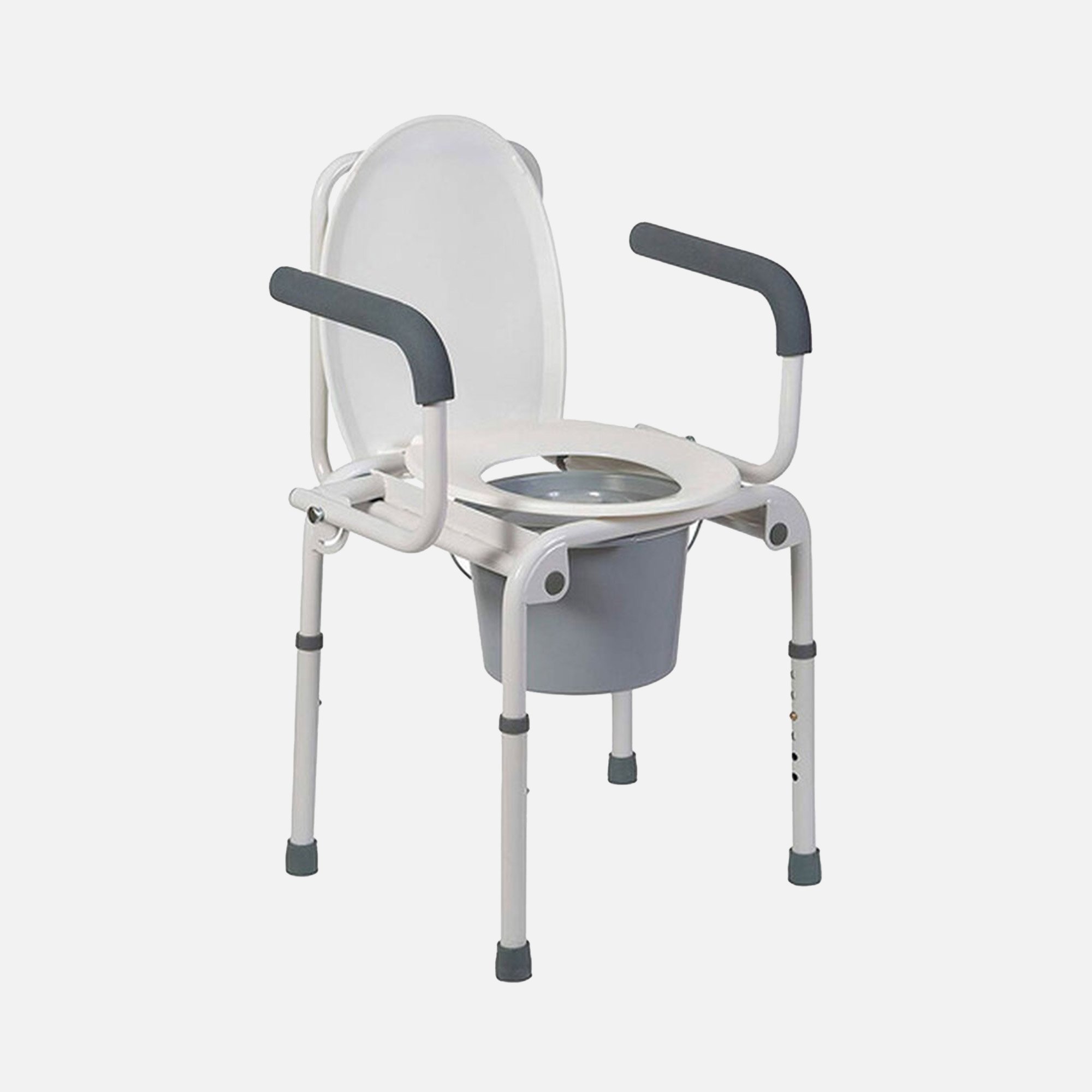 K.D. Deluxe Steel Drop-Arm Commode (Tool-free) Easy to assemble frame. Easy-to-release drop arm mechanism allows for safe lateral patient transfers to and from commode. Ideal for those with limited dexterity. Durable plastic snap on seat and lid. Easy to clean grey powder coated steel finish. Plastic armrests and back provide extra comfort and support. Comes with 12 qt. commode bucket with carry handle and splash shield. 19 ? 23". 300 lb. capacity. drop arms, deluxe steel, 19-23" height, 2 each