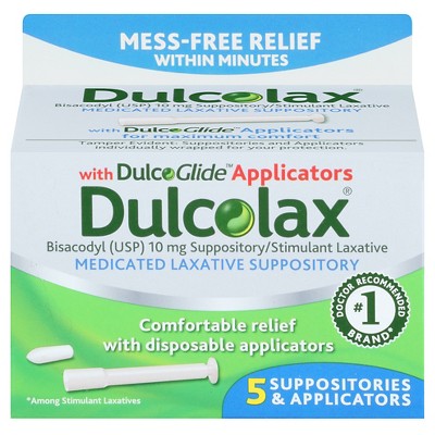 Dulcolax Laxative Suppositories (16 Ct) Fast, Gentle Relief INCLUDES: One (1) 16-count box of Dulcolax Medicated Laxative Suppositories FAST RELIEF: These suppositories provide reliable and fast relief in 15-60 minutes FOR RECTAL USE ONLY: Dulcolax comfort-shaped suppositories are for rectal use only; do not swallow ACTIVE INGREDIENT BISACODYL: Dulcolax Medicated Suppositories are made with active ingredient bisacodyl, which helps increase movement in the intestines # 1 DOCTOR RECOMMENDED: Dulcolax is the No. 1 doctor-recommended laxative brand *among OTC laxatives