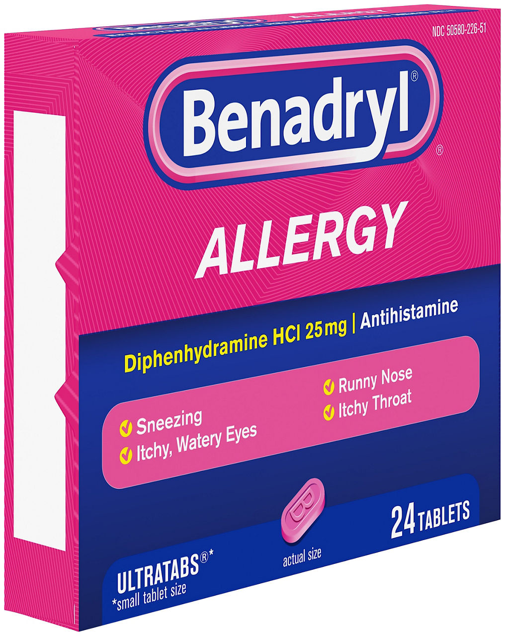 Equate Allergy Relief Capsules, 25 mg, 100 Count: 100 capsules Active ingredient is Diphenhydramine HCl, 25 mg, which is an antihistamine Temporarily relieves these symptoms due to hay fever or other upper respiratory allergies: sneezing, itchy, watery eyes, runny nose, and itching of the nose or throat Temporarily relieves these symptoms due to the common cold: runny nose and sneezing Compare to Benadryl active ingredient