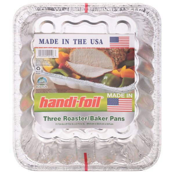 Heavy Duty Aluminum Roasting PanThis package contains one EZ Foil Super Roaster Heavy Duty Disposable Roaster Pan, measuring 16 x 12 x 3.25 inches Build In RackKeep food crisp & perfectly browned with this disposable turkey roasting pan featuring a built-in rack Holds Up To 25 PoundsReliable & sturdy construction makes this disposable roaster pan strong enough for holiday turkeys & your heartiest recipes Oven Safe & Recyclable Bake your favorite recipes without worry in this recyclable foil roaster pan, oven safe to 450 F Won't Buckle Under PressureCarry your meal from oven to table without worry, thanks to the dependable construction of this foil roaster