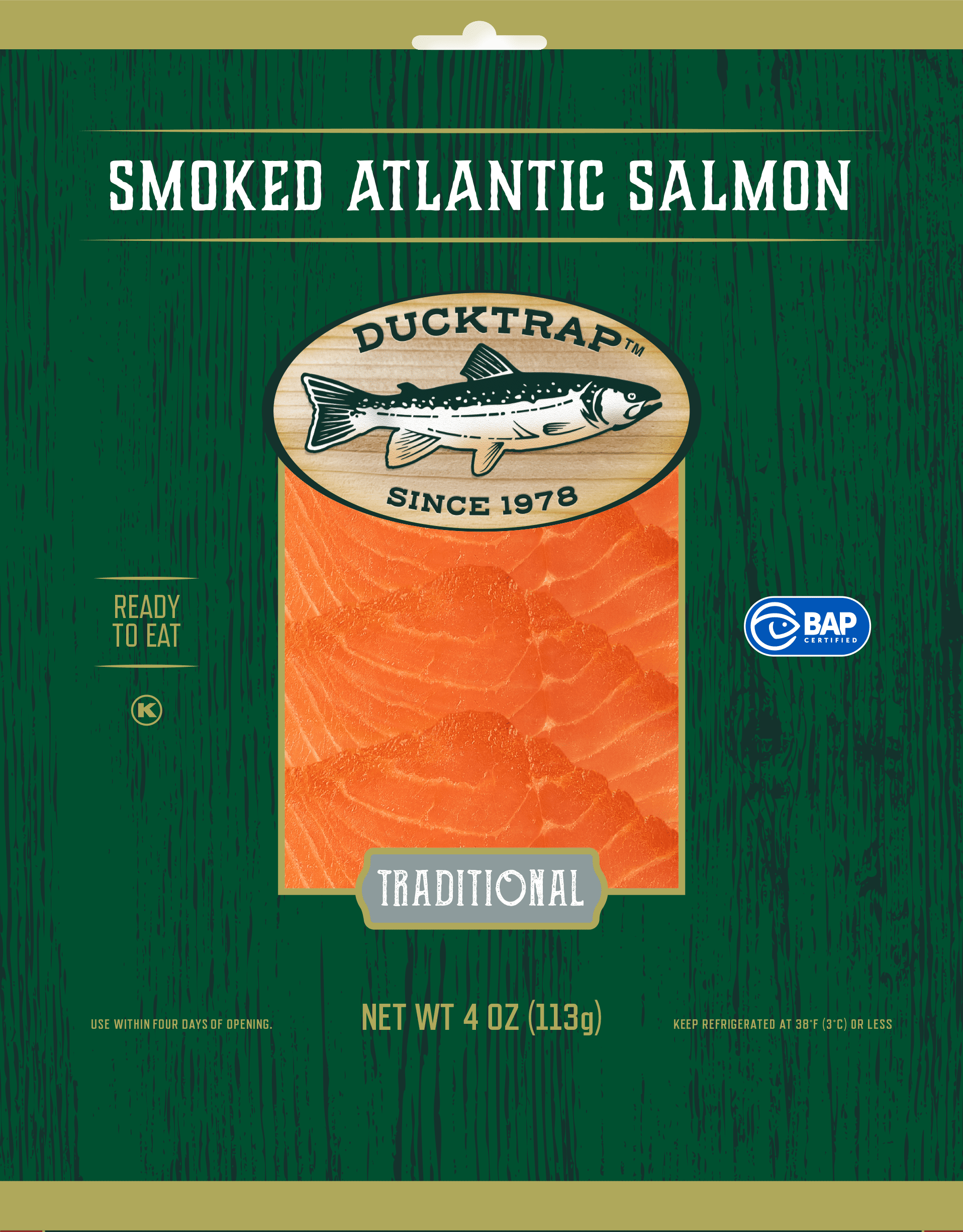 Ducktrap traditional-style smoked Atlantic Salmon 4oz comes from beautiful waters and is always produced from Farm Raised Atlantic Salmon. Ducktrap has perfected brining and smoking recipes to accentuate the distinct flavor of salmon. Our signature flavor is developed by slowly cold smoking with a unique combination of local Maine maple, oak, cherry and apple woods. This taste is a robust blend of the woods and sea. Skinless, trimmed and thinly sliced, Ducktrap Cold Smoked Atlantic Salmon is ready-to-eat...