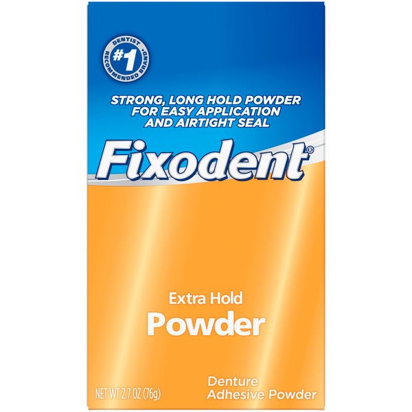 Fixodent's easy-to-use Extra Hold Denture Powder Adhesive provides a hold that lasts all day. Use it just once a day for strong hold that lets you laugh, talk, eat, and drink with confidence! Easy Application for a Strong, Long Hold Airtight Seal. Comes in a recyclable carton. From the #1 Dentist Recommended Brand*. Experience Life, Not Dentures. *among dentists that recommend brands of adhesive