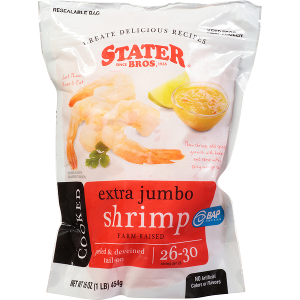 Stater Bros. Markets Peeled & Deveined, Tail-On, 26 to 30 ct., Cooked Extra Jumbo Shrimp