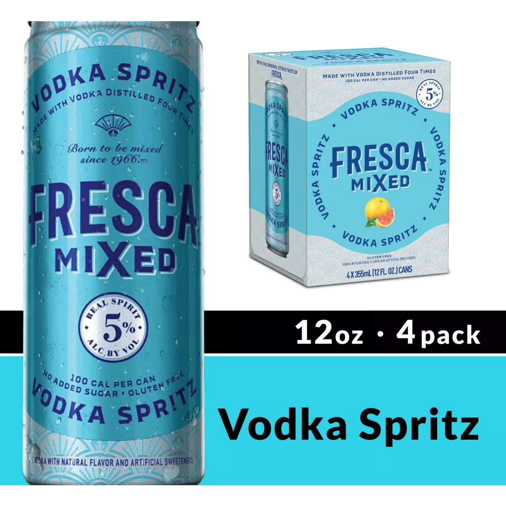 Fresca Mixed Vodka Spritz Grapefruit Citrus Gluten-Free Canned Cocktail, 4 Pack, 12 fl oz Cans, 5% ABV 4 pack of 12 oz (355 mL) slim cans of Fresca Mixed Vodka Spritz Grapefruit Citrus Gluten-Free Canned Cocktail Vodka seltzer cocktail with juicy citrus flavors Ready made mixed drinks great for enjoying straight from the can or served over ice in cocktail glasses Gluten-free can vodka cocktail with 100 calories per 12-oz serving Premixed cocktail great for backyard BBQs, picnics, beach trips, cocktail parties, or poolside gatherings Premium cocktail with 4x-distilled vodka Ready to drink canned cocktail made with real vodka, the citrus taste of Fresca, and no added sugar This 10 proof prepared cocktail contains 5% alcohol by volume Seltzer cocktail cans in a conveniently portable citrus flavored vodka drink 4 pack Fresca Mixed: Born to Be Mixed Since 1966