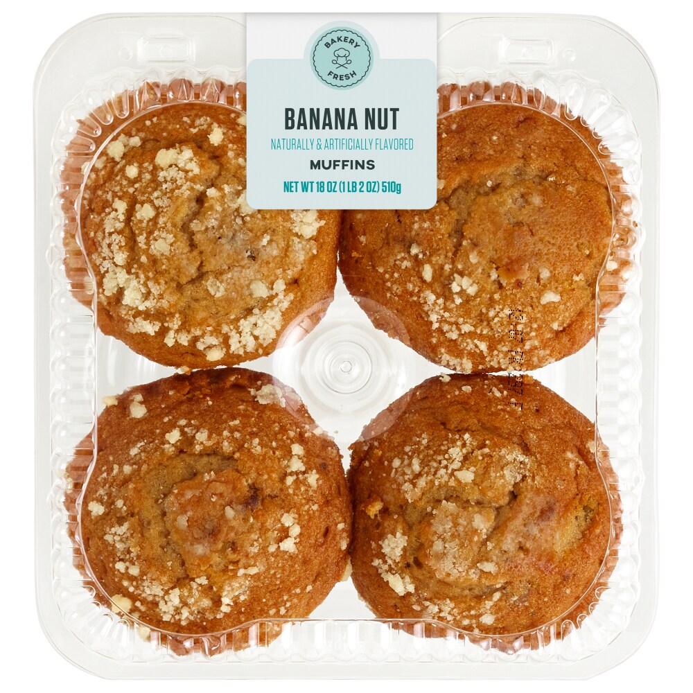 14-ounce package of 4 banana nut muffins. Naturally and artificially flavored. Kosher Dairy Certified. Contains wheat, milk, eggs, and walnuts. May contain soy and other tree nuts. Our Fresh brand products are all about high-quality food that fits every budget, every day.