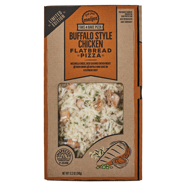 Buffalo Style Chicken Mozzarella Cheese, Diced Seasoned Chicken Breast And Green Onions With Buffalo Wing Sauce On A Flatbread Crust Take & Bake Pizza, Buffalo Style Chicken