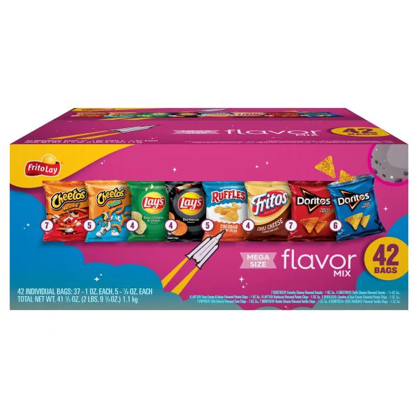 42 Count Flavor Mix Box Includes: 7 - Cheetos Crunchy Cheese Snacks, 5 - Cheetos Puffs Cheese Snacks, 4 - Lay's Sour Cream & Onion Potato Chips, 4 - Lay's Barbecue Potato Chips, 5 - Ruffles Cheddar & Sour Cream Potato Chips, 4 - Fritos Chili Corn Chips, 7 - Doritos Nacho Cheese, and 6 - Doritos Cool Ranch. Great snacks your whole family will enjoy! Shelf-Stable / Ambient Individually Packaged Frito-Lay Brands Multipack Snacks Individually packaged for easy on-the-go and flavor-filled snacking