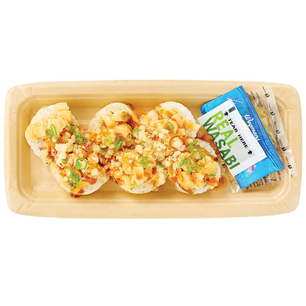 RICE (WATER, RICE, SEASONED VINEGAR [SUGAR, RICE VINEGAR, SALT, WATER, BROWN SUGAR], SOYBEAN OIL, MONOGLYCERIDE), IMITATION CRAB LEG MEAT (POLLOCK, WATER, WHEAT STARCH, SUGAR, POTATO STARCH, EGG WHITES, MIRIN SAUCE [SAKE, SUGAR, SALT, WATER, YEAST EXTRACT], SALT, SOYBEAN OIL, NATURAL FLAVORS, CRAB FLAVORS, MODIFIED FOOD STARCH, CITRIC ACID, PAPRIKA OLEORESIN, LYCOPENE, SOY LECITHIN, COLOR), EBI SHRIMP (SHRIMP, SALT), AVOCADO, CUCUMBER, DRIED NORI, GREEN ONIONS, SESAME SEEDS, MAYONNAISE (SOYBEAN OIL, EGG YOLKS, WATER, DISTILLED VINEGAR, SUGAR, SALT, MUSTARD, SPICES, CALCIUM DISODIUM EDTA [TO PROTECT FLAVOR]), CAJUN SPICE BLEND (SPICES [CHILI PEPPERS], SALT, PAPRIKA, CANOLA OIL, OLEORESIN PAPRIKA), SWEET CHILI SAUCE (SUGAR, WATER, PICKLED RED CHILI, DISTILLED VINEGAR, GARLIC, SALT, XANTHAN GUM). SOY SAUCE (WATER, WHEAT, SOYBEAN, SALT, VINEGAR), WASABI (WATER, WASABI POWDER, CITRIC ACID, MUSTARD OIL, SOYBEAN OIL), GINGER (GINGER, WATER, SUGAR, SALT, VINEGAR, ACETIC ACID, CITRIC ACID, VITAMIN C).