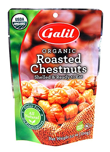 ORGANIC CHESTNUTS - Galil Roasted Chestnuts are a great natural snack. 100% organically grown chestnuts are hand-selected and fire- roasted for exceptional quality and taste.. SNACKING, BAKING, COOKING - Galil Roasted Chestnuts are perfect for cooking and baking in all your favorite recipes: soups, stuffing’s, cookies, and cakes. Shelled and ready to eat straight out of the bag.. PACK OF 6 – Enjoy 6 bags of ready to eat chestnuts. Each bag is 3.5 ounces.. Organic, All-Natural, Non-GMO, Gluten-Free, Vegan, Kosher, High in Fiber. Best of all they are nutritious and a good source of Vitamin C and Fiber.