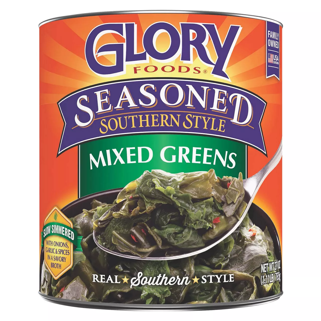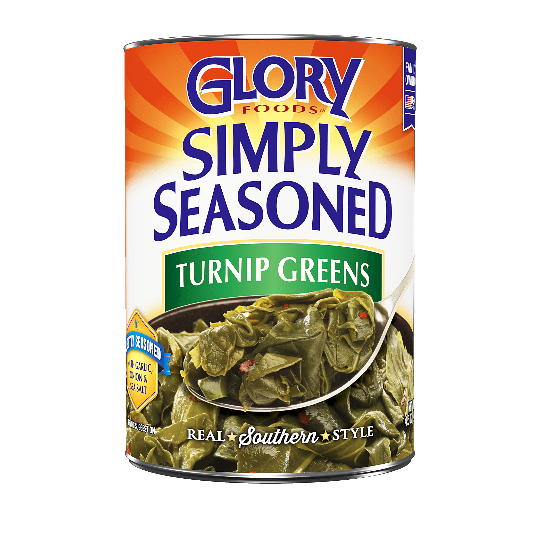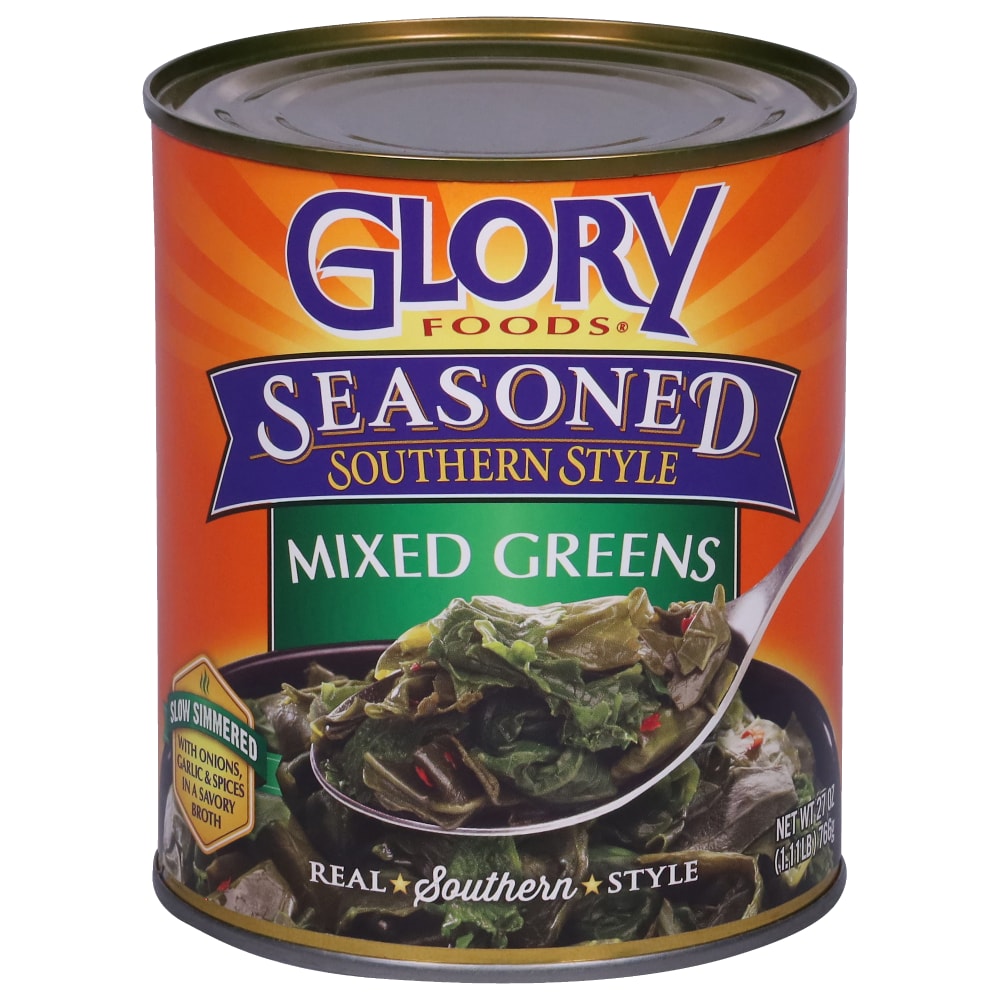 Glory Foods Mixed Greens are a perfect blend of cut leaf turnip and mustard greens slow simmered in a meat-free broth with onions, garlic and spices. Our simple seasoning provides a delicious taste with 50% less sodium than our traditional variety.