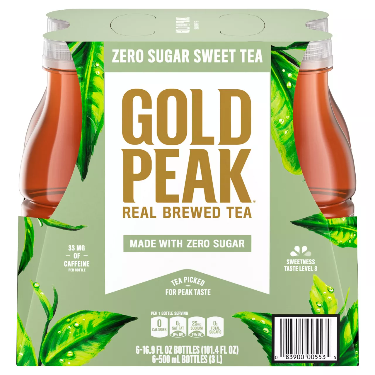 Gold Peak is real brewed tea made from tea leaves picked for peak taste - enjoy the zero-calorie option, Gold Peak Zero Sugar Tea. Tea bursting with refreshingly natural flavors. Perfect for the whole family, these convenient bottles let you take real brewed tea wherever you go.Whether itâs a picnic in the park, watching the game, or a backyard barbeque, get that delicious fresh brewed flavor with every sip. Gold Peak Zero Sugar Tea is a zero-calorie tea that uses pure filtered water for a difference...