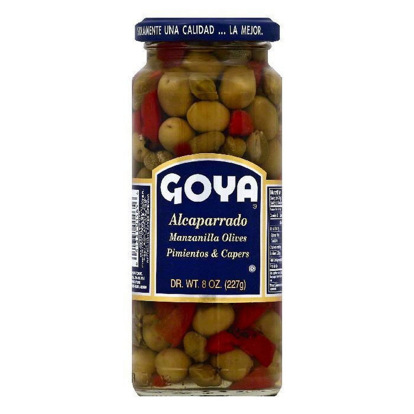 GOYA Pitted Alcaparrado Manzanilla Olives Pimientos & Capers 9.50 Oz.: Manzanilla Olives, Pimientos & Capers Kosher Product of Spain Goya brings authentic Latino cuisine to your kitchen