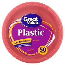 Great Value Plastic Plates are durable, practical, and come in a stylish, vivid red. These cut-resistant plastic plates are easy and disposable when you don't need the hassle of cleaning up. Confidently serve or enjoy all of your favorite main courses and their complimentary side dishes on these sturdy plates that can stand up to even the heartiest meals. Toss them in your trunk for quick and easy meal prep when you're on the go, or have on hand in the pantry for every day mess free meal serving....