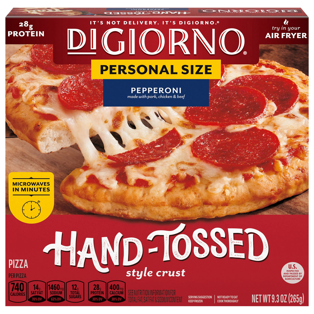 Crust: Enriched wheat flour (flour, niacin, reduced iron, thiamine mononitrate, riboflavin, folic acid, enzyme), water, contains 2% or less of: sugar, yeast, soybean or corn oil, corn meal, salt, sodium bicarbonate, sodium aluminum phosphate, diacetyl tartaric acid esters of mono and diglycerides [datem], ascorbic acid, may also contain: dextrose, enzymes, L-cysteine, vital wheat gluten, sodium stearoyl lactylate, wheat starch, canola oil, mineral oil, sunflower lecithin). Whole milk mozzarella cheese (cultured pasteurized milk, salt, enzymes), sauce (water, tomato paste, seasoning [sugar, salt, onion and garlic, cornstarch, spices, guar gum and xanthan gum, citric acid, maltodextrin], food starch modified, soybean oil). Pepperoni (pork, beef, salt, contains 2% or less of dextrose, garlic powder, lactic acid starter culture, natural spice extractives, oleoresin of paprika, sodium nitrite, spices, BHA, BHT, citric acid).