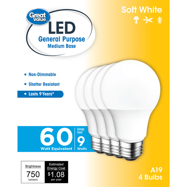 Great Value LED Light Bulbs 8.5W, 60W Equivalent, Soft White, 10K, 4-Pack: