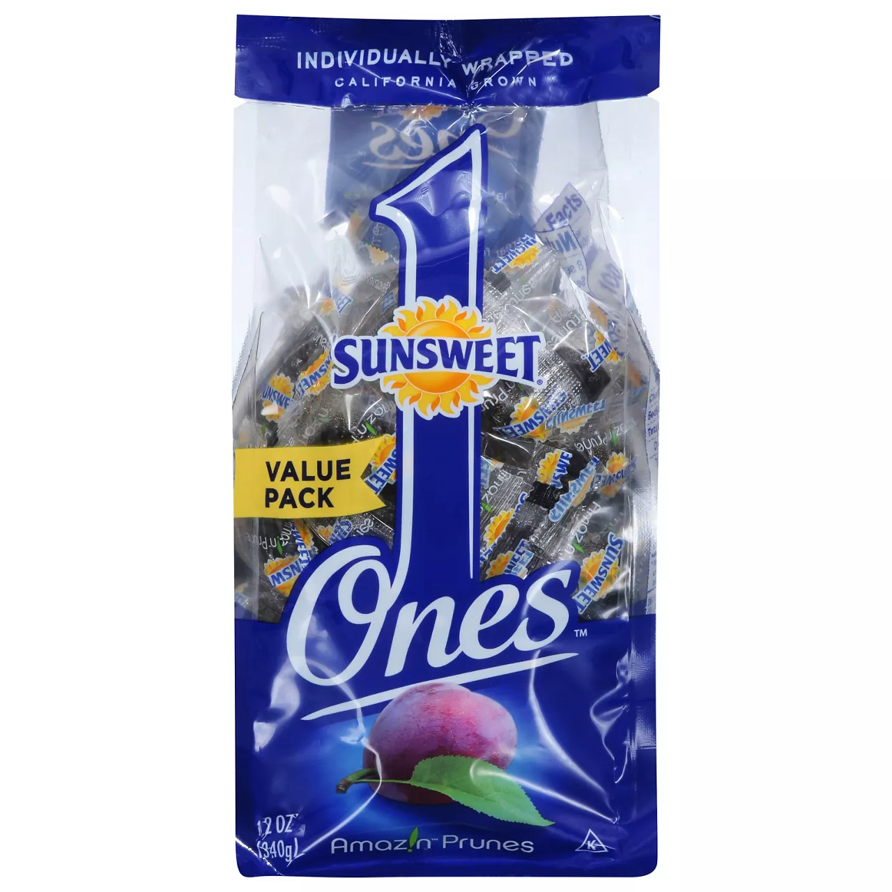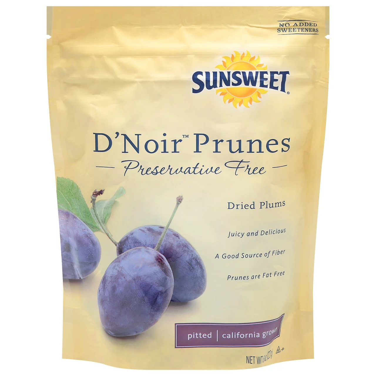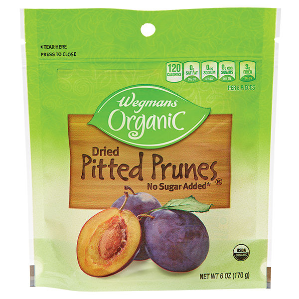 Great Value Pitted Prunes, 8 oz Naturally sweet with no added sugars Packed with antioxidants High in fiber and potassium Unsweetened pitted prunes help maintain a healthy digestive system No sulfites, artificial colors or artificial flavors Resealable bag helps preserve freshness Certified kosher and organic Fat and cholesterol free Great addition to salads, yogurts, cereals, oatmeal, and trail mixes