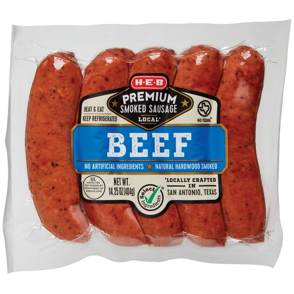 For dinner tonight, try some H-E-B Premium smoked beef sausage links. These beef sausages are naturally hardwood smoked and locally crafted in San Antonio, Texas. Just heat and eat these juicy sausages in a soft roll or with your favorite sides.
